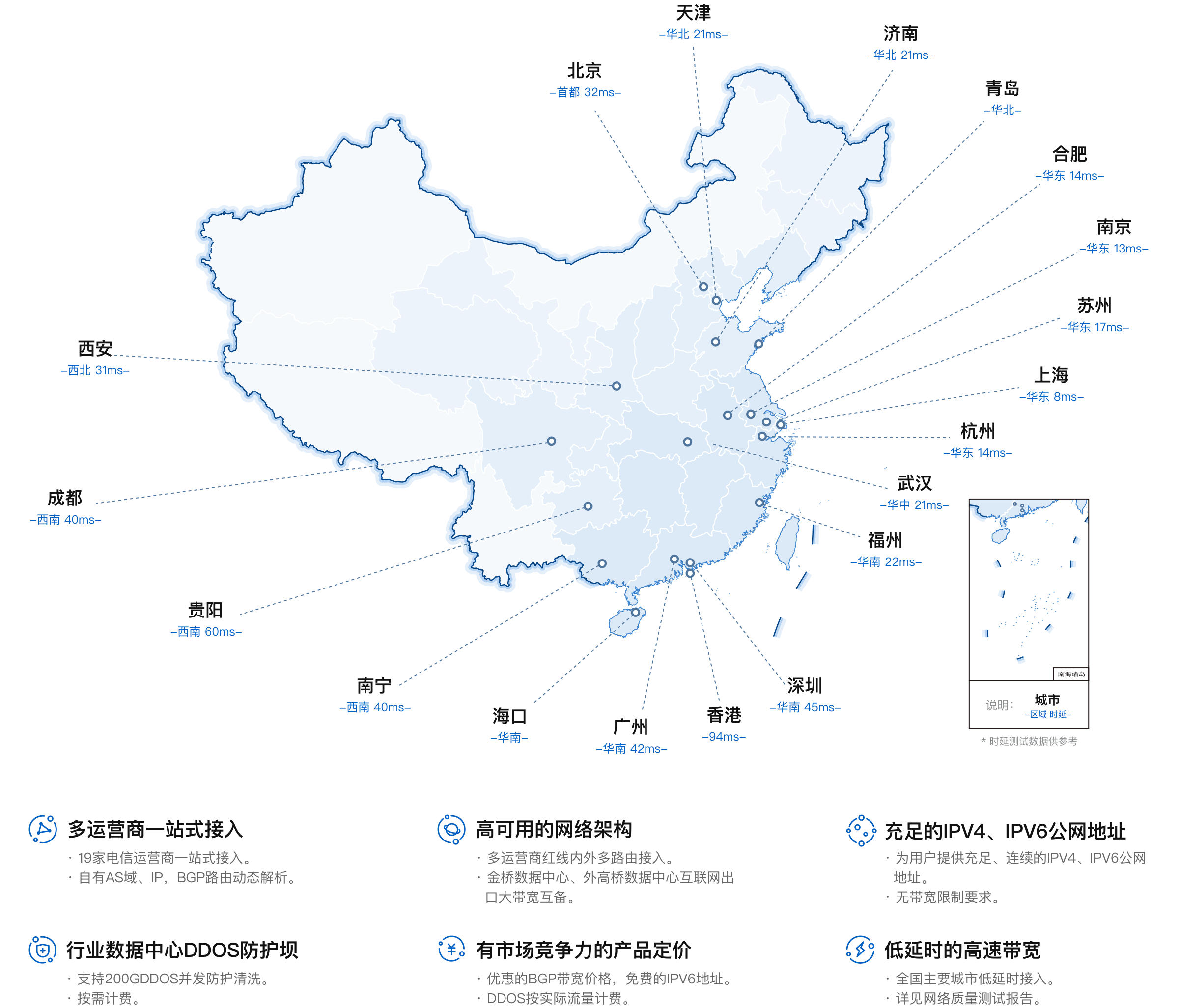 通過(guò)BGP協(xié)議對(duì)接19家電信運(yùn)營(yíng)商,提供高可用、低延時(shí)的BGP互聯(lián)網(wǎng)服務(wù)。 |